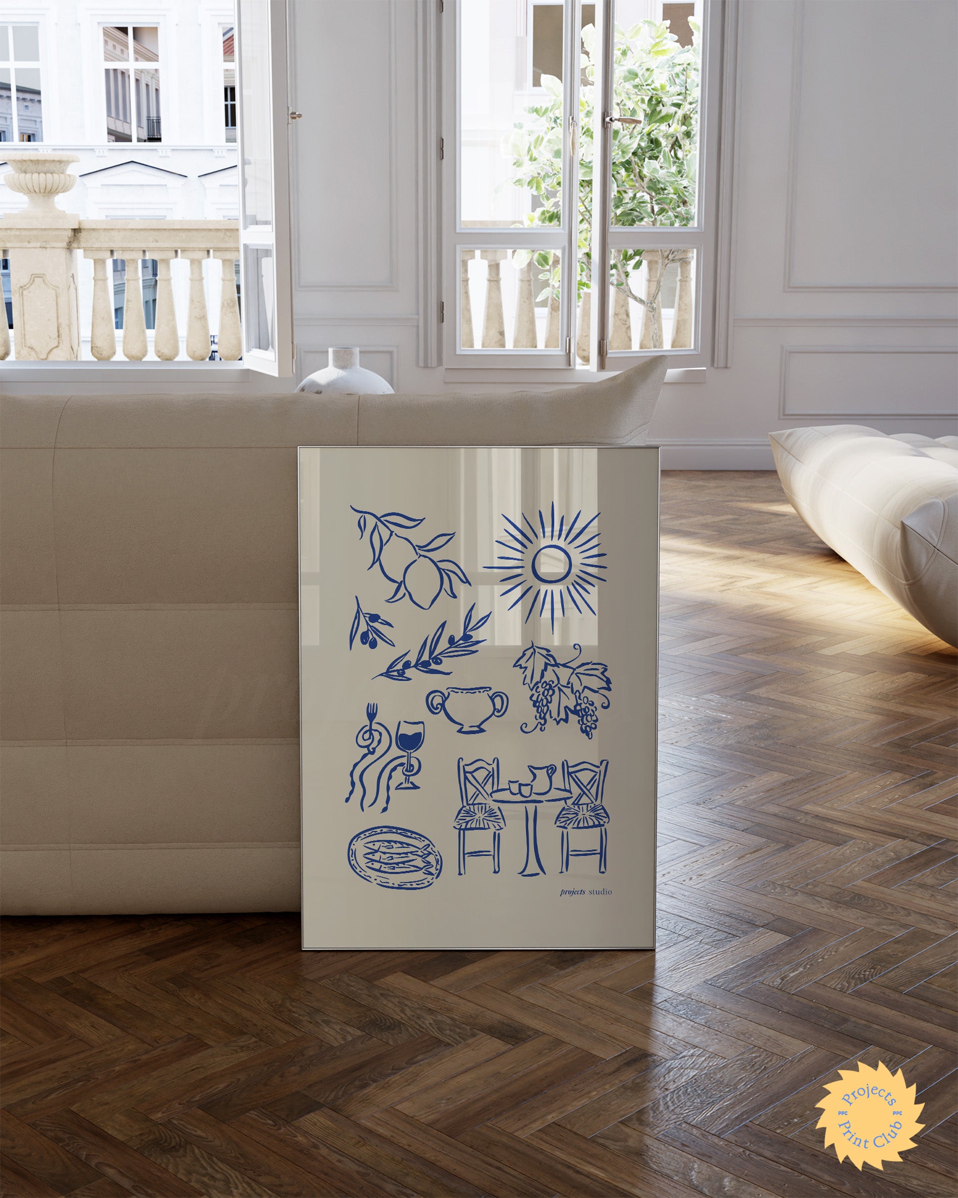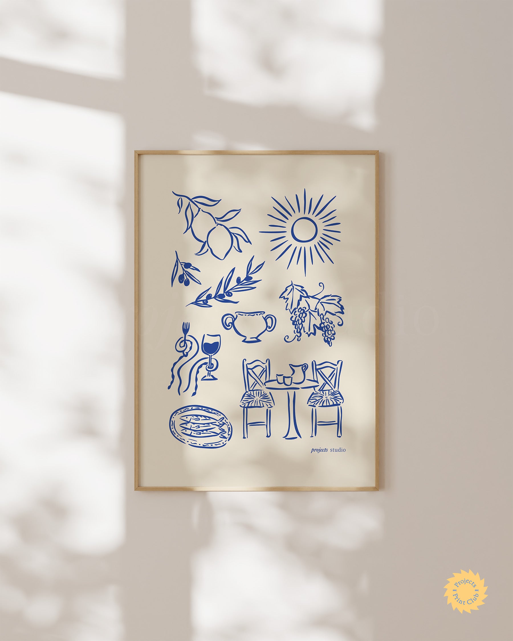 Our Greek Taverna Print is inspired by slow afternoons along seaside towns and sharing mezze at blue-painted tables with bougainvillea climbing whitewashed walls, chilled wine with the soft light of a Mediterranean evening. This print for your kitchen, bar cart or dining room, a way to bring the warmth of a Greek island holiday into your everyday life. The original illustration was created with a Japanese ink pen, then digitally edited to create this colourful print.